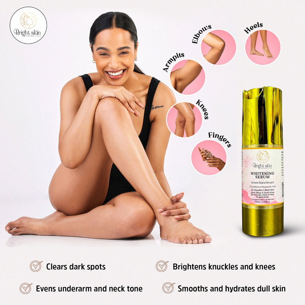 Rich in glutathione, hyaluronic acid and vitamin C, it can lighten pigmentation :(dark knuckles, dark armpits ,dark neck, dark knees ,dark armpits , underarms, dark feet and any others dark areas on your body ) promote metabolism, even skin tone, improve dull skin and make skin clear and shiny.