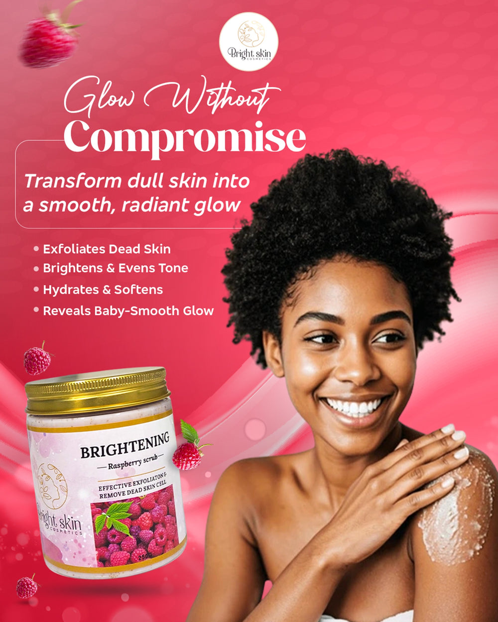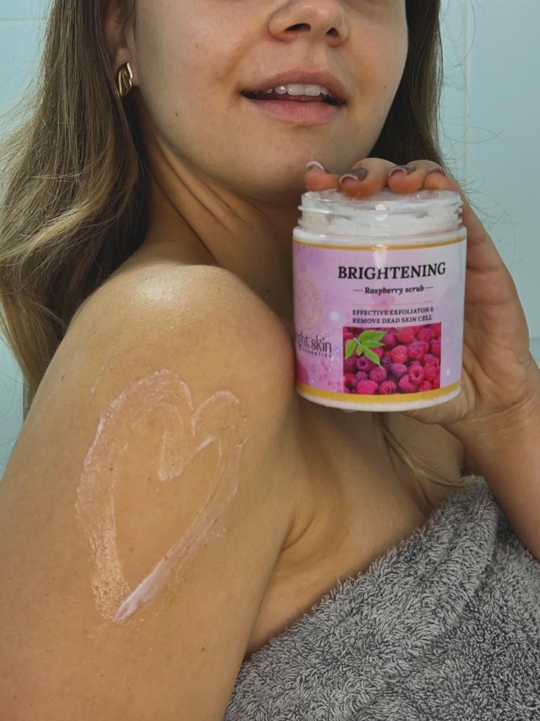 Raspberry Extract body scrub can clean pores, whiten and moisturize. It smoothly exfoliate pores ,dry ,rough skin, and restore Baby skin. Suitable for all skin types
